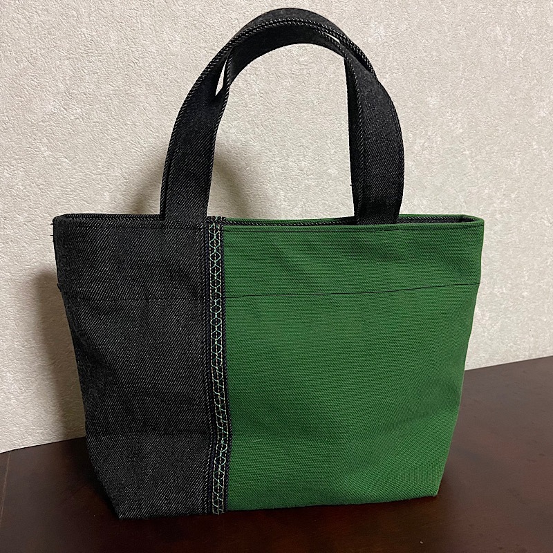 ■帆布とデニム生地を組み合わせたミニトートバッグ。