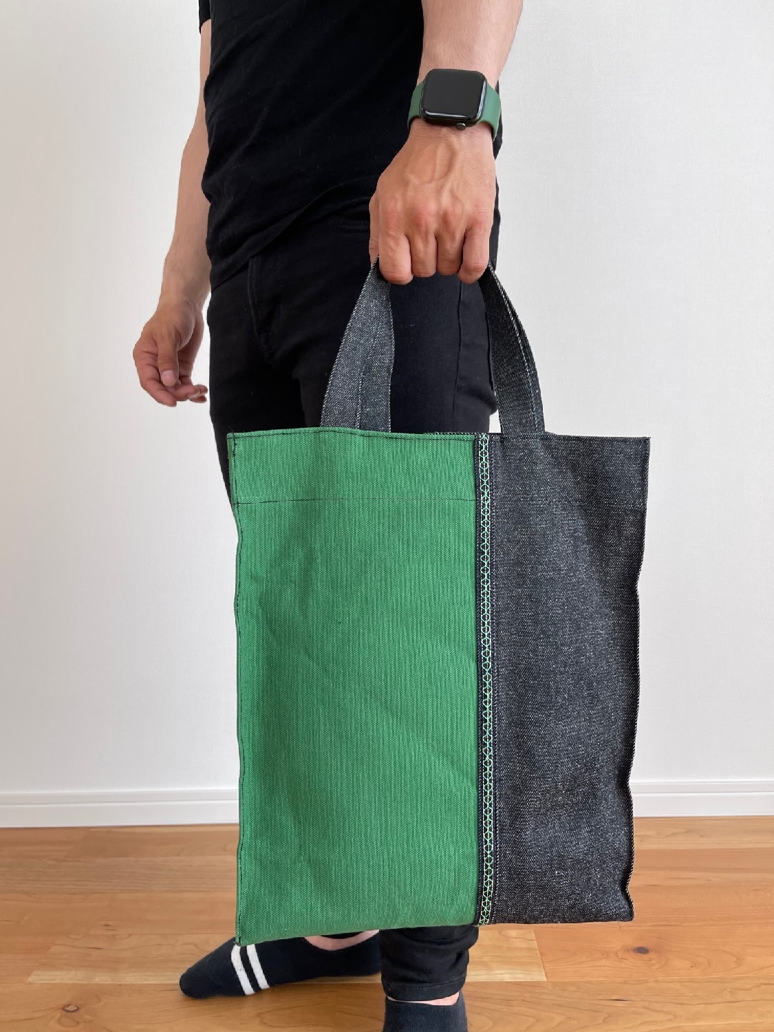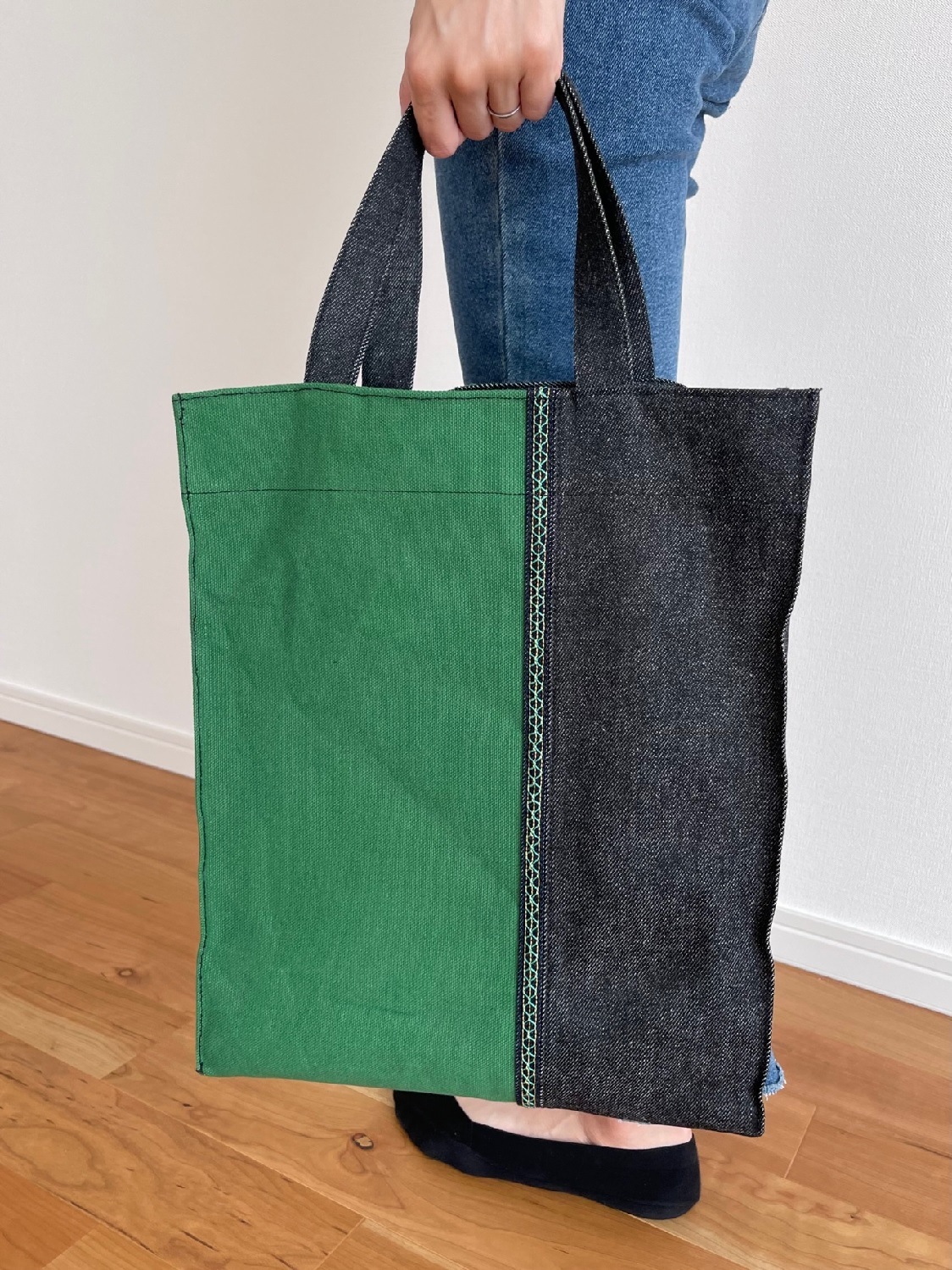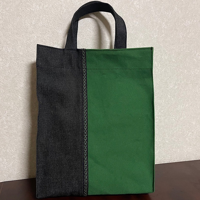 ■帆布とデニム生地を組み合わせたタテ型トートバッグ。A4サイズが入る大きさに仕上げております。