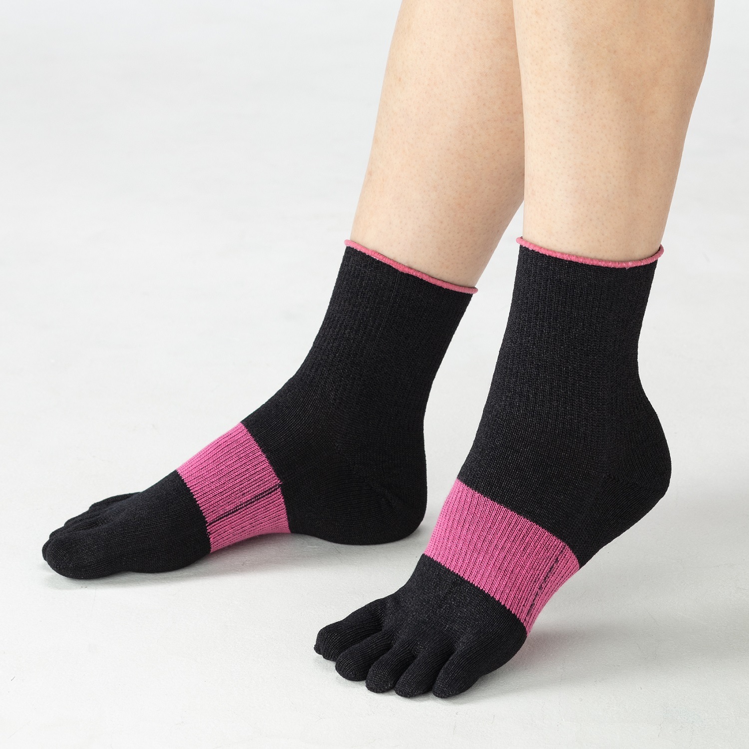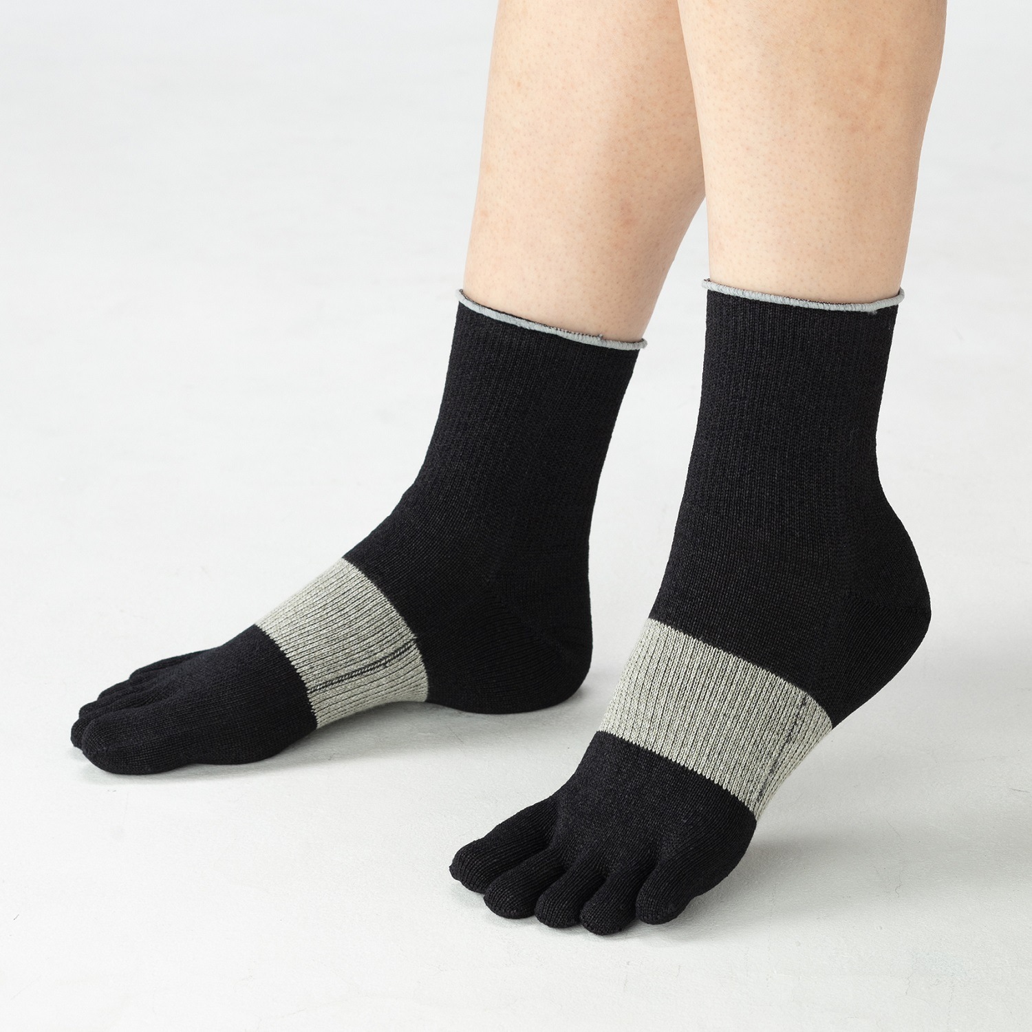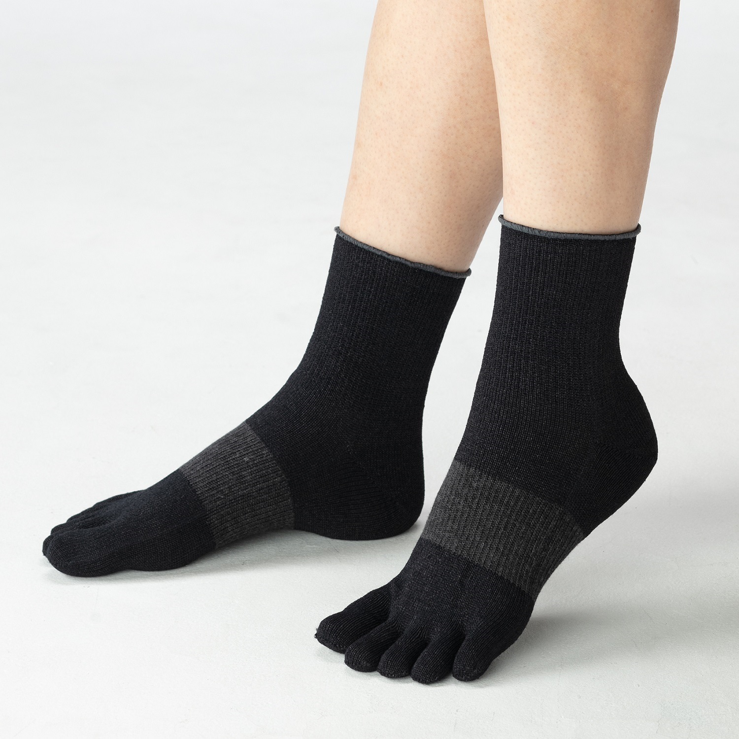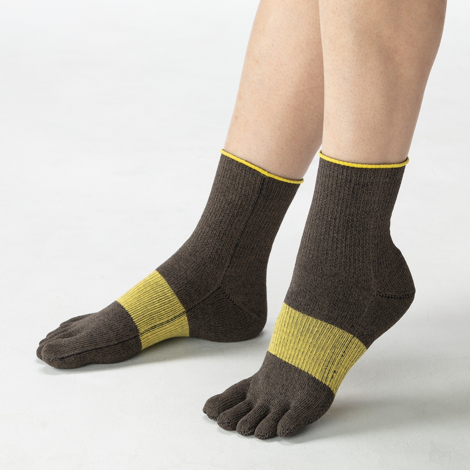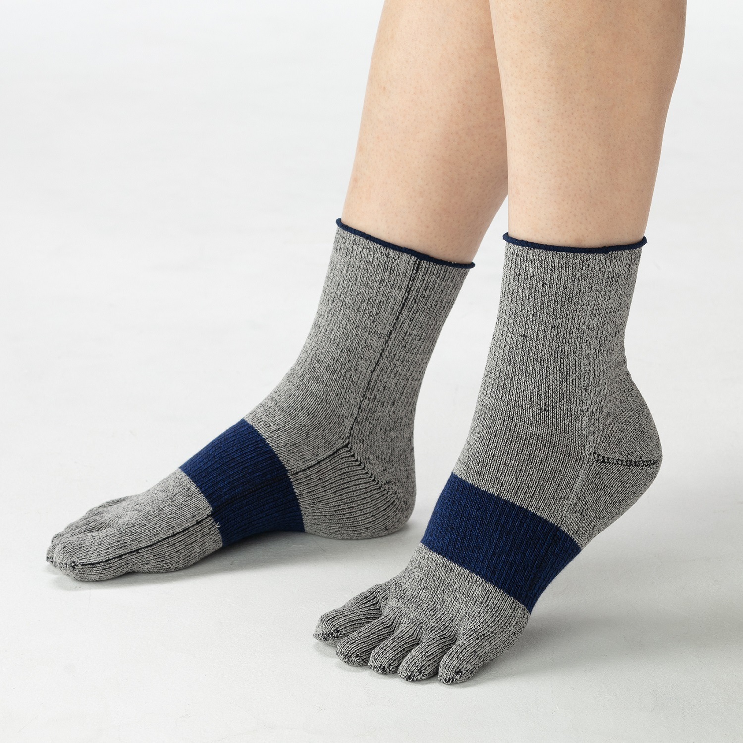■肌に優しいコラーゲン加工糸を肌に触れる内側に、汗を吸って蒸れを解消する和紙の糸を外側に編んだ、5本指ソックス。ミドル丈。